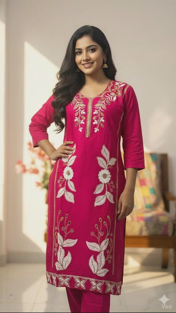 Pink Embroidered Kurti Pant Dupatta Set for Women | Elegant Floral Design Ethnic Wear